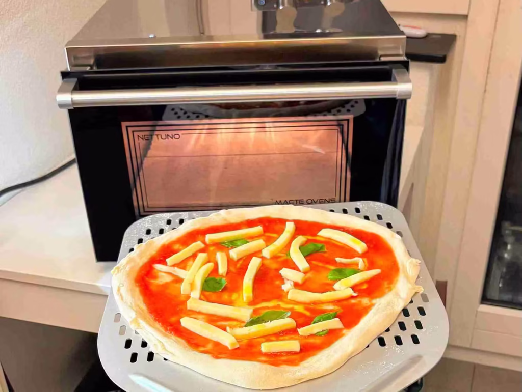 Wer auch mal Brot oder Focaccia backen will, kommt mit den an CH-Standardsteckdosen verwendbare Pizzaöfen Voyager Smart und Effeuno N3 nicht weit, da ihnen die Höhe und die bei längeren Backzeiten erforderliche Unterhitze fehlt. Macte Ovens bietet mit dem Nettuno eine preisgünstige Option sämtliche Optionen offen zu halten – was der Ofen taugt, erfährst du im pizzaschaufel.ch Testbericht. Unboxing Der Macte Nettuno kommt wie sein kleiner Bruder, der Voyager Smart im unscheinbaren Karton daher, nicht einmal der Name des Ofens wird erwähnt. Nach dem Öffnen springt einem die Anleitung in NFC-Kreditkartenform (was auch immer das bringen soll, den meisten wäre eine ausgedruckte Anleitung wohl lieber) und die nochmals eingepackte Türe entgegen. Unter der Tür und der Anleitung befindet sich der Ofen selbst – wie bei uns üblich kommt dieser natürlich direkt mit dem für die Schweiz zugelassenen Stecker bzw. hier Fixadapter. Nach dem Entnehmen des Ofens findet man, wie leider häufig bei Italienischen Herstellern, Styropor. Der Nettuno kommt mit zwei Steinen, einem Cordierit für Brot Focaccia & co sowie einem Biscotto di Casapulla, welche sich beide halbiert und verpackt im Ofeninnern befinden. Inzwischen setzt Macte bei den durch sie selbst verkauften Öfen auf billig Biscotti welche nicht unseren Qualitätsvorstellungen entsprechen, weshalb wir weiterhin exklusiv nur Öfen mit dem teureren Biscotto Saputo für euch herstellen lassen. Da der Macte Ovens Nettuno eine untere Heizschlange hat, ist es wichtig die Steine hintereinander und nicht nebeneinander zu platzieren (ansonsten drücken die Steine auf die Heizschlange). Bevor wir obiges Bild erstellten, galt es noch die Schutzfolien zu entfernen und die Türe zu montieren. Was uns besonders gefällt ist das Scharnier, welches sich ohne Hilfe von Nägeln offenhalten und dann sichern lässt (bitte hinschauen und lernen Effeuno!). Aufheiztest Bevor wir unseren Macte Ovens Nettuno einbrennen und nach dem erneuten Abkühlen zu unserem beliebten Aufheiztest antreten lassen können braucht der Ofen natürlich Strom. Da der Pizzaofen mit oberem und unterem Heizelement auf über 2.3 KW Leistung kommt (2.975 KW, um genau zu sein) kann er nicht an der Schweizer Standard Haushaltssteckdose (T13) betrieben werden. Aber keine Sorge, nahezu alle Bauten mit Elektroinstallationen neuer als 20 Jahre haben irgendwo eine T23 Steckdose (meistens für Waschtürme, Geschirrspüler und ähnliche Gerätschaften) welche bis 3.68 KW verträgt. Jedenfalls wurden sogar wir in unserem Block aus den 50-er Jahren mit 2003 renovierter Küche fündig. Für den Geschirrspüler gibt es eine T23 Steckdose (obwohl der Geschirrspüler gemäss seinem Stecker sich eigentlich mit 2.3 KW begnügen müsste – aber wir beklagen uns natürlich nicht über eine Steckdose mit mehr Leistung für unseren Pizzaofen). Damit wir von der Platzierung her etwas flexibler waren haben wir uns noch ein T23 Verlängerungskabel zugelegt. Nach diesem kleinen Steckdosenexkurs nun zu unserem Aufheiztest. Da die Verpackung des Macte Nettunos keine grossspurigen Versprechungen macht, haben wir mal nach 15 Minuten zu messen begonnen. Infrarotthermometer für Pizzaofen Jetzt kaufen Wer also (wie wir) dachte, der Nettuno würde mit seinen fast 3KW wesentlich schneller aufheizen als ein Voyager Smart mit 1.9KW täuscht sich – da es viel mehr Raum aufzuheizen gilt, ist die Aufheizleistung etwa gleich oder sogar minim langsamer als beim kleinen Bruder. Schon bald nach der 500° Messung erreichte der Ofen ein OH – Over Heat, sprich über 550° und für unser Thermometer somit nicht mehr messbar. Der Nettuno, italienisch für Neptun, erreicht also sehr hohe Temperaturen. Inwieweit der Name eines ca. -200° kalten Planeten zu einem sehr heiss werdenden Pizzaofen passen soll muss jede*r für sich selbst beurteilen. Backtest Ein Novum steht an in unserer Testreihe, so werden wir im Nettuno nicht nur Pizza sondern, da der Ofen insbesondere auch dafür gemacht ist, auch Brot backen. Zuerst aber zu unserer klassischen Margherita. Pizzaschaufel 33 cm mit Holzgriff Jetzt kaufen Für den Teig haben wir wie immer auf das AVPN Standardrezept gesetzt und, da wir gleich eine etwas grössere Menge Teig (Acht Teiglinge) machten, das Kneten unserer Sunmix Easy 6 überlassen. Sunmix Easy 6 inkl. LED Beleuchtung Jetzt kaufen Auch im Nettuno sind bei höheren Temperaturen (ab ca. 420°C) Drehungen nötig. Profi-Drehschaufel rund 20 cm Jetzt kaufen Auch die weiteren Pizzen gelangen uns auf Anhieb sehr gut – was bei den richtigen Temperaturen und einem Biscotto Saputo auch nicht verwunderlich ist. Bald jedoch stellten wir fest, dass das untere Heizelement für unseren momentanen Bedarf (mit Pausen von ca. 2-3 Minuten zwischen den Pizzen) zu viel Hitze abgibt und mussten da etwas runterregeln. Schön zu wissen, dass man noch absolut genügend Reserve hat aber abgesehen vom erstmaligen Aufheizen und von grösseren Anlässen mit sehr schnellem Einschiessen der Pizzen wird man das untere Heizelement im Pizzaszenario wohl nie gebrauchen. Nach dem Abstellen der Unterhitze gelangen uns perfekte Pizzen mit perfekten Böden. Fior di Latte 1 kg Jetzt kaufen 24 x San Marzano Bio La Carmela 400G Jetzt kaufen Bambus Pizzabrett Jetzt kaufen Pizzawiegemesser Edelstahl mit Holzgriff 35 cm Jetzt kaufen Da der Nettuno aber eben nicht nur für Pizza konzipiert wurde haben wir ihn wie schon versprochen auch mit Brot getestet. Dazu haben wir jeweils 400 Gramm Mehl (z.B. Ruch, Pizza oder ähnlich, was mit dieser Hydration nicht funktionieren würde, wäre Dinkelmehl), 8 Gramm Salz und eine Prise Trockenhefe mit 300 Gramm lauwarmem Wasser zusammengerührt (ohne Kneten) und so zwei bis drei Stunden stehen lassen. Danach haben wir den entstandenen «Teig» 4-Fach gefaltet (mit Fokus aufs Falten, kein Zerreissen bzw. Kneten) und so auch gleich etwas auf Spannung gebracht. Danach landete der Teig für die Nacht im gut bemehlten Gärkörbch