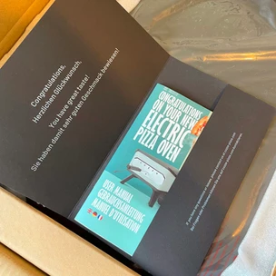 In der Packung befindet sich neben der Gebrauchsanweisung natürlich der Ofen selbst, ein Cordierit Pizzastein und ein Blech welches dank anzuschraubendem Griff als Türe dienen wird.