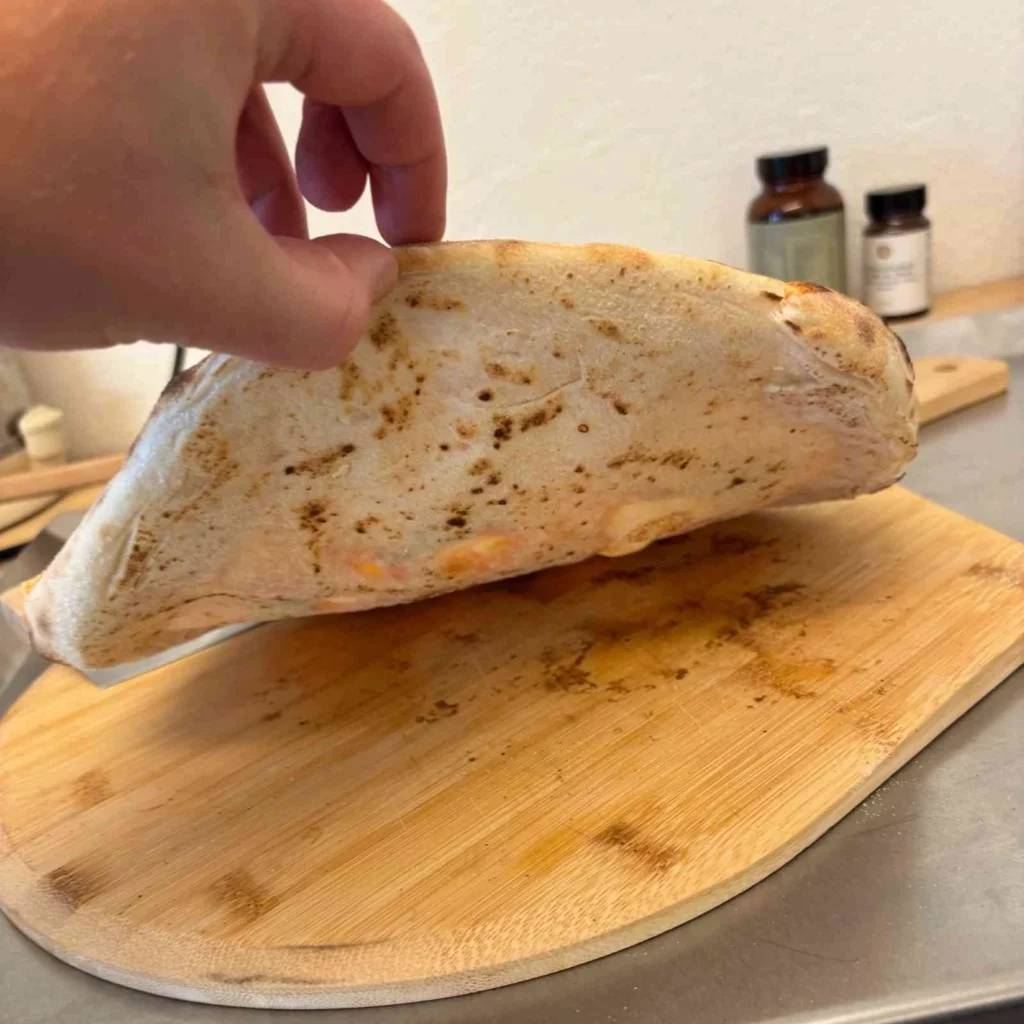 Wie man auf obigem Bild sieht, gestaltet es sich als etwas schwierig eine normalgrosse Teigmenge (250-260 Gramm) auf einer 30 cm Schaufel zu platzieren. Mit dem Volt 2 sollte man also eher mit kleineren Pizzen und Teigmengen von 220-230 Gramm arbeiten.