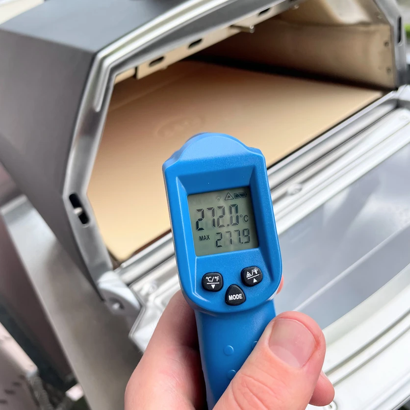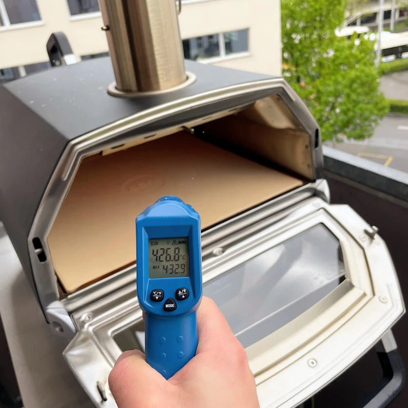 Nach weiteren 30 Minuten (also insgesamt 45 Minuten) stieg die Temperatur nicht mehr weiter. Das Ofenthermometer legte sich auf 429 Grad fest – ein Messwert den auch unser Infrarot Thermometer bestätigte. Besitzer des Karu 16 brauchen also nur ein Infrarotthermometer, wenn sie die Hitzeverteilung im Ofen überprüfen wollen – ist der Ofen einmal heiss sollte das eingebaute Thermometer wohl ausreichen.