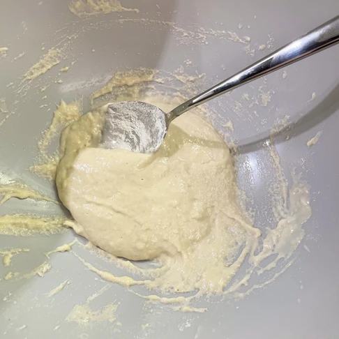 Um den Vorteig anzusetzen verwendete ich zusätzlich 50 Gramm Caputo Doppio Zero und 5 Zentiliter lauwarmes Wasser.