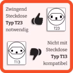 Kann nicht an einer Schweizer Hauhaltssteckdose betrieben werden und benötigt zwingend eine T23 Steckdosede, welche in den meisten Haushalten für einen Geschirrspüler, Backofen, Waschturm oder ähnliches vorhanden ist. Falls du nur eine Haushaltssteckdose zuhause hast, so schaue dir den Macte Voyager Smart oder den Effeuno N3 an.