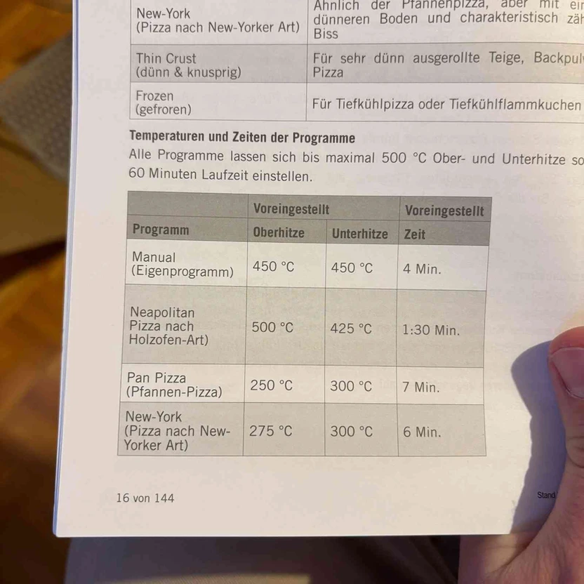 Was weniger gut als das Rezeptbuch ist, ist die Voreinstellung im Manual-Programm. Eine Pizza bei 450° Celsius 4 Minuten backen zu wollen, hilft sicher für die Bewerbung beim Krematorium, aber in der Küche ist diese Backzeit einiges zu lang, 90 bis 120 Sekunden würden reichen.